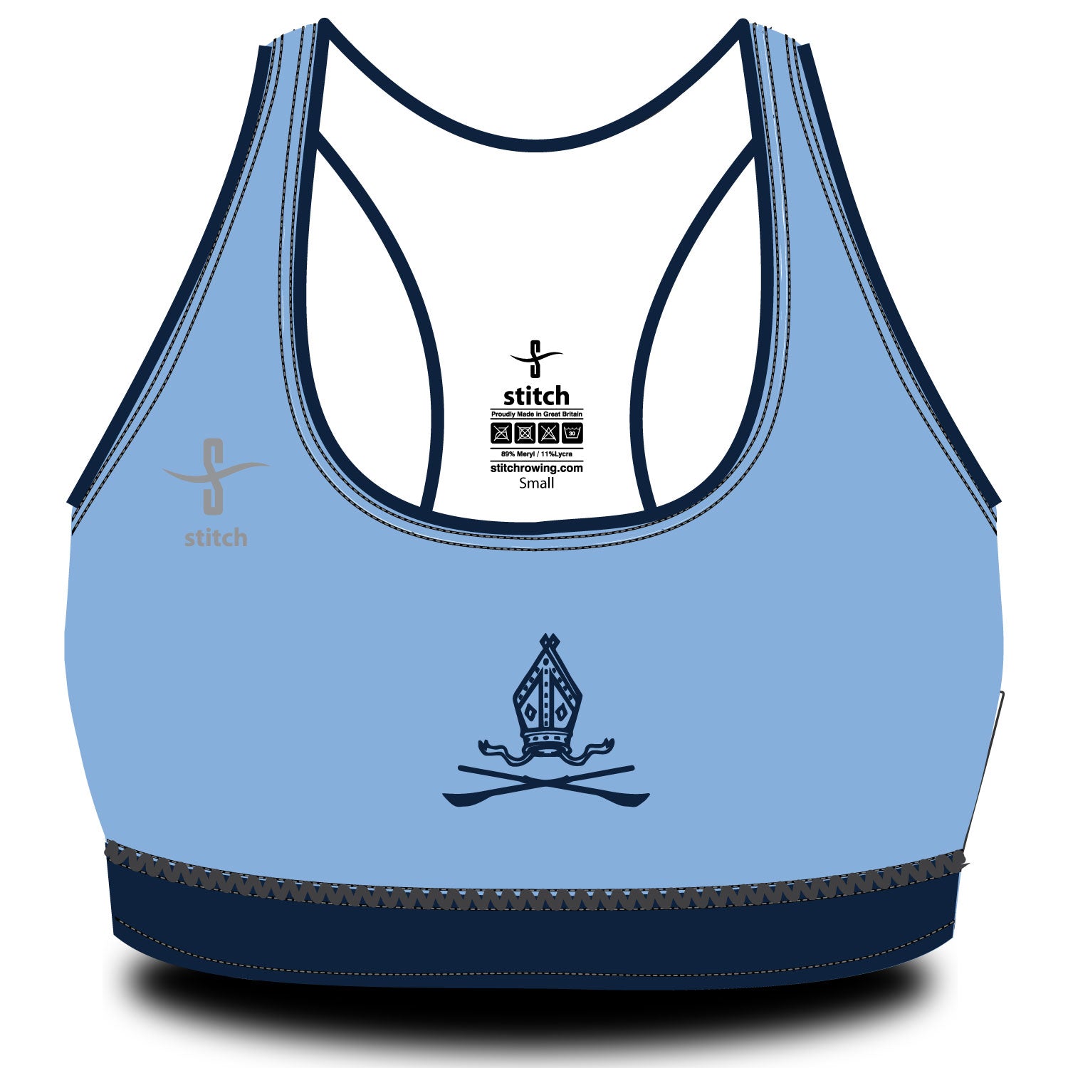 Stitch Rowing Medium Support Bra. Proudly made in Great Britain. All purpose sports bra with double lining. Allows you freedom of movement. Fabric Meryl - Lycra® actisytem fabric has the superior performance benefits of modern fibre technology with an exceptionally soft handle combined with the durability and robustness of nylon. Lycra® is the branded elastane from Invista (formerly DuPont) that stretches 5 times in length with full recovery to give enhanced fit and performance characteristics including four-way stretch. It is fully breathable and its moisture management performance keeps you cool and dry. Light and windproof, Meryl - Lycra® also dries quickly. The comfort and stretch of this fabric cannot be beaten and it offers excellent protection to UVA and UVB rays from exposure to sunlight. To top this off Meryl keeps its vibrant colour and softness, wash, after wash, after wash. XS = 8 S = 10 M = 12 L = 14 XL = 16 XXL = 18